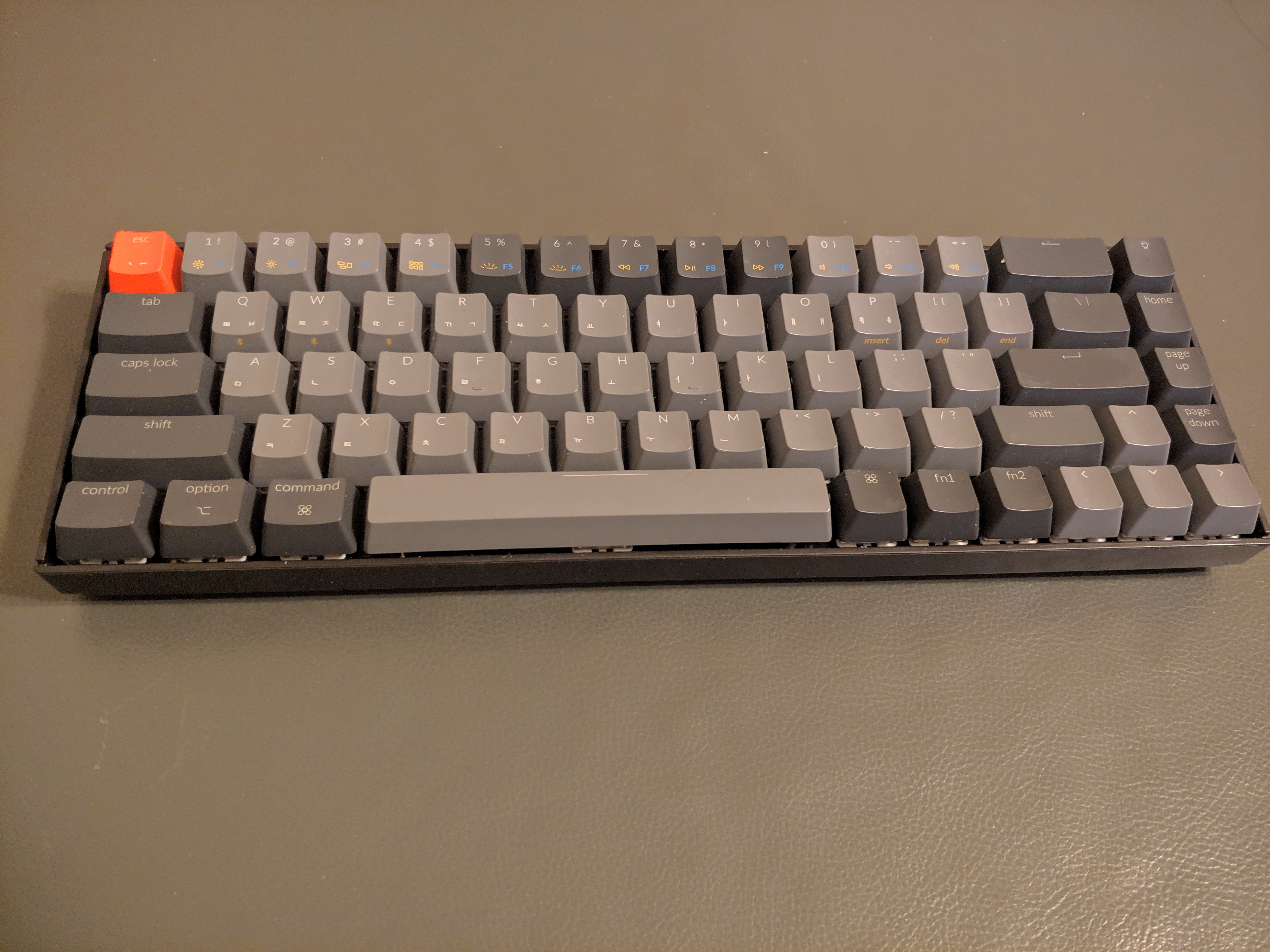 사실 키감은 레오폴드 fc750r가 더 좋는데(키크론도 키캡을 바꾸면 더 나아질 수도 있다) 약간의 키감 변화와는 비교가 안되는 3기기 자유로운 무선 연결+더 작은 크기와 이동성이 주는 편리함이 매우 크다. 좌우분리는 되지 않지만 그만큼 들고 옮기기도 살짤 더 수월하다.